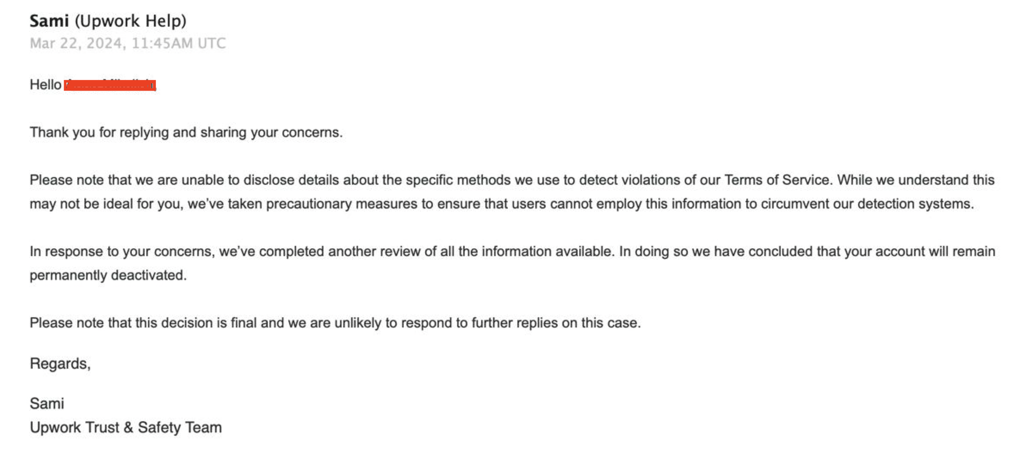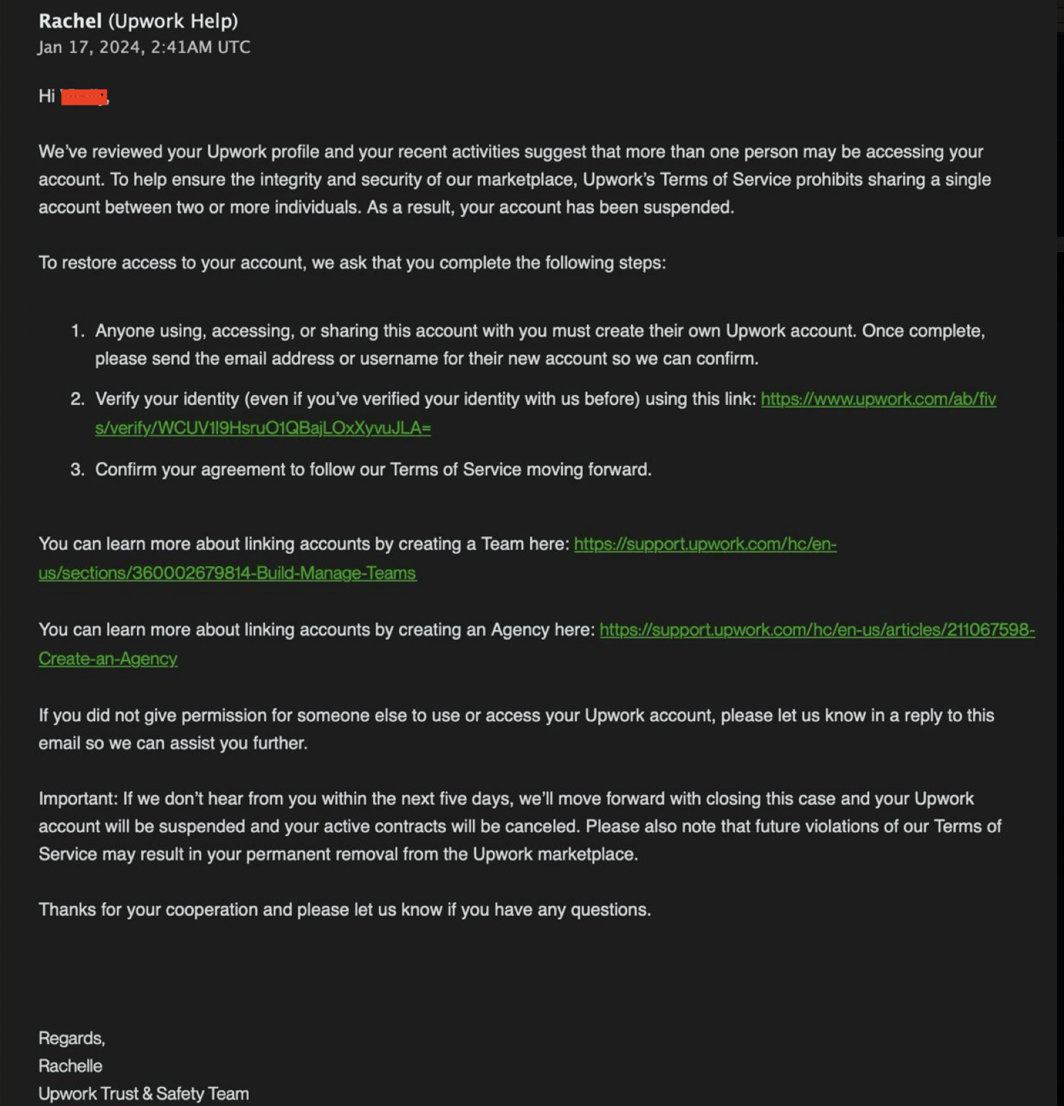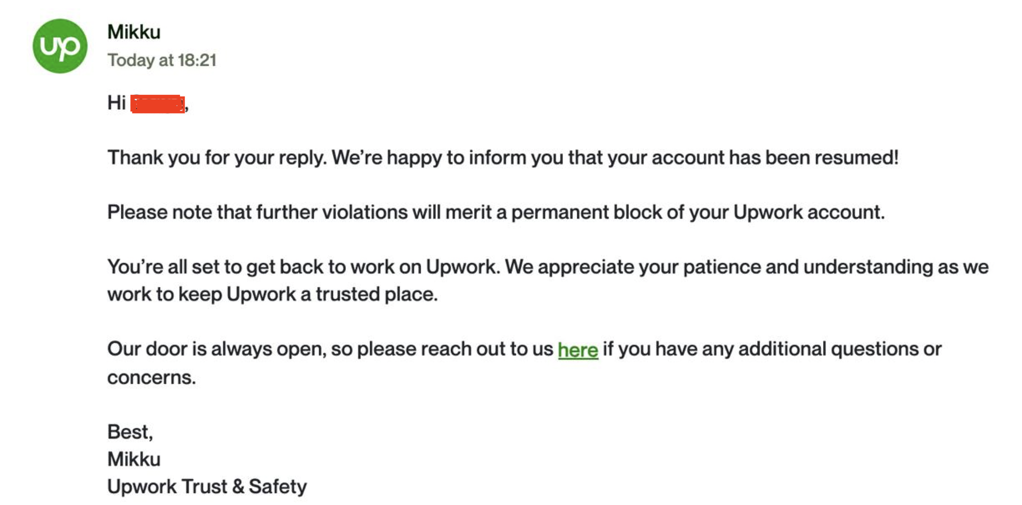 There are two usual types of ban on Upwork: temporary hold and permanent ban. The first one is quite easy to resolve. Just follow the instructions. Here is an example: