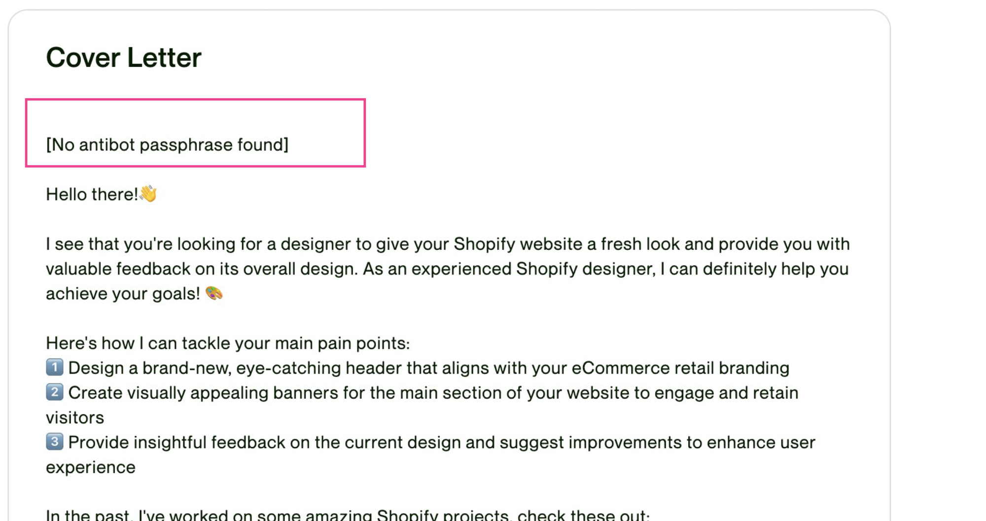 2. Sometimes, he just mentions exactly in the bid that he didn't find the antibot words🤦♀️: