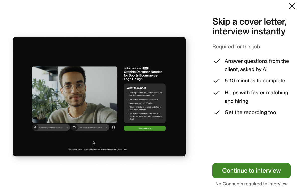 So what is the instant interview? It's 5-10 mins interview that you pass with UMA to match with the job and be hired. Intersting, that it could be required or not. Also, if it's not required, you can submit the proposal with connects. Ibstant interviews are free.
