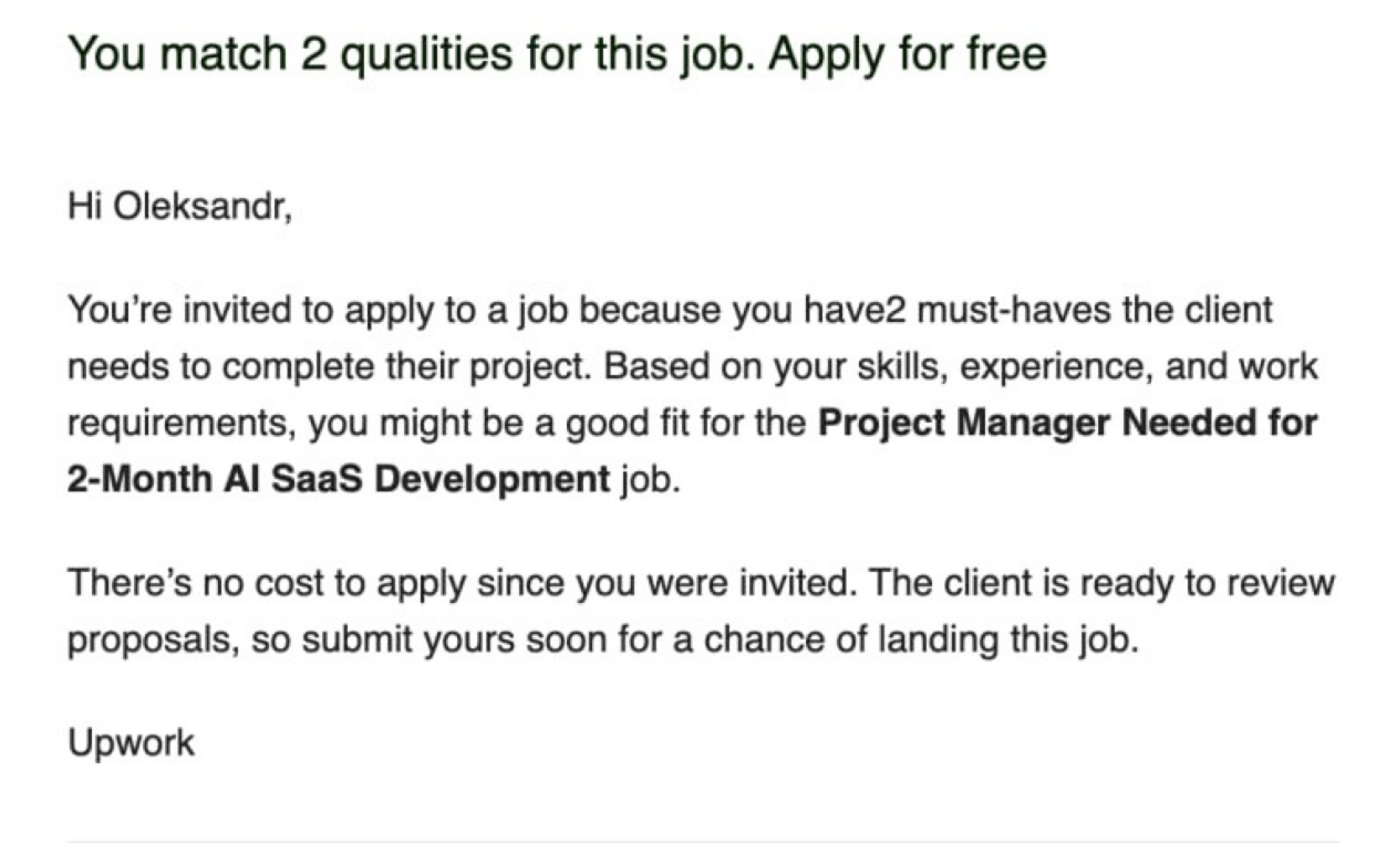 One more news that one of my course students sent me yesterday is that now, if Upwork invites you to apply to a job, the bid is free!