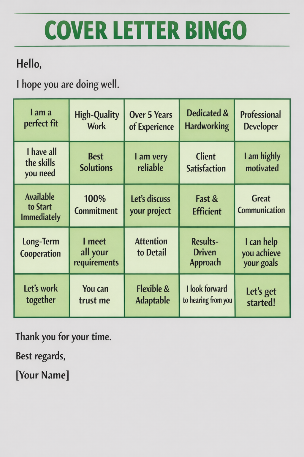 Make sure, people will open your cover letter.You need a bright start (joke, emoji, himan touch, question). You can't win by keeping your usual I am web dev with 10 years of experience.