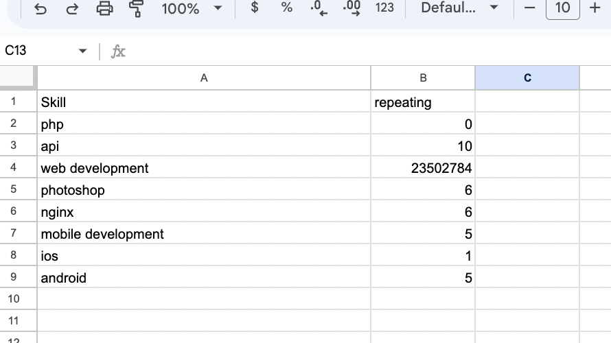 - Create an easy Google spreadsheet and start writing skills there from these job posts. When the skill is repeating - add a number near it
