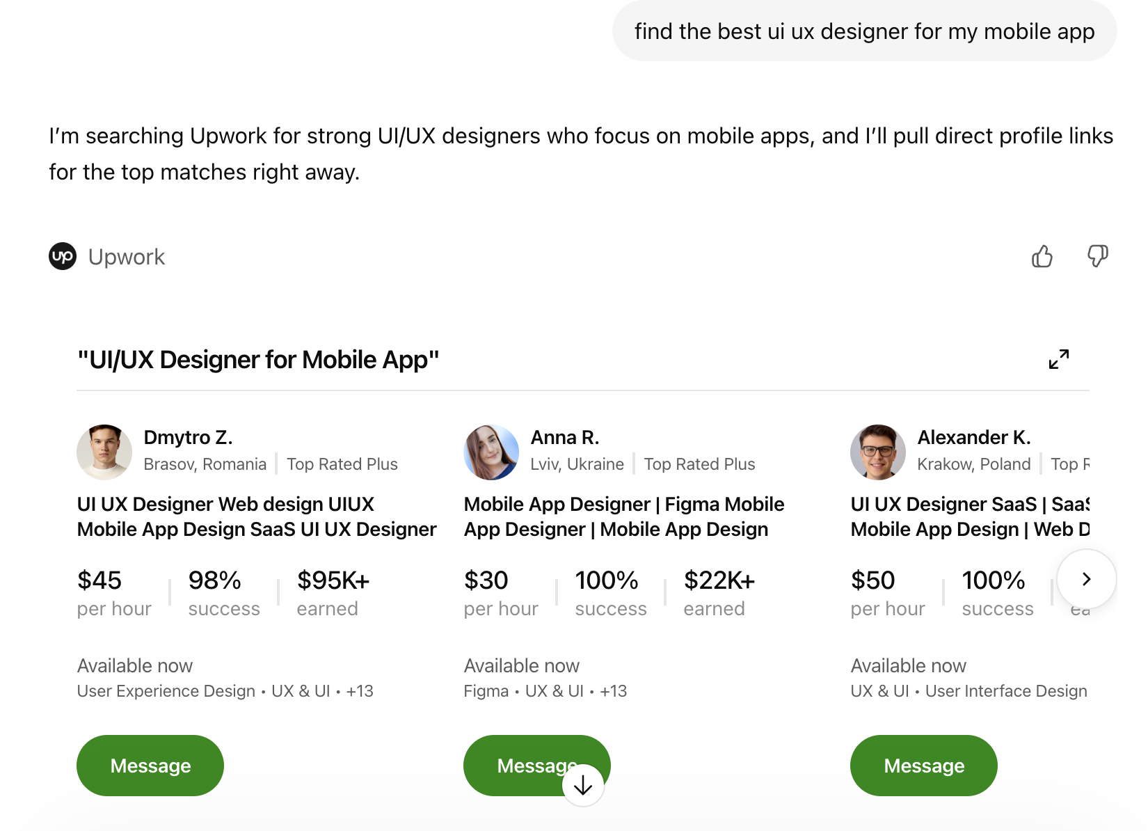 - ChatGPT and Upwork. Chatgpt is showing freelancers from the Upwork so the message can be done from there and invite as well. The freelancers are taken from the /hire list.
