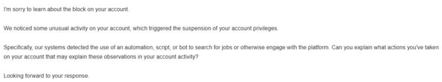 Upwork is triggered by too many page updates. Most of my clients are already unblocked by explaining that they were just searching themselves in a talent search or updating the job search. Don't forget to send them your browser history.